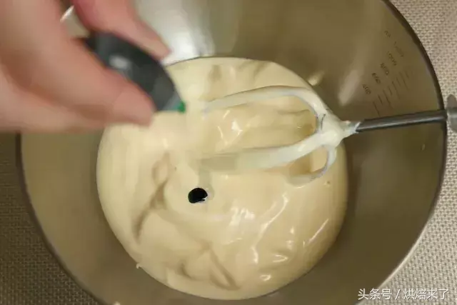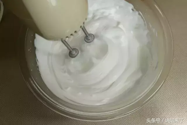 淡奶油+幼砂糖③用均震机打至7成起泡即可。(量小所以用了均震机,也可以用打蛋器噢~)
