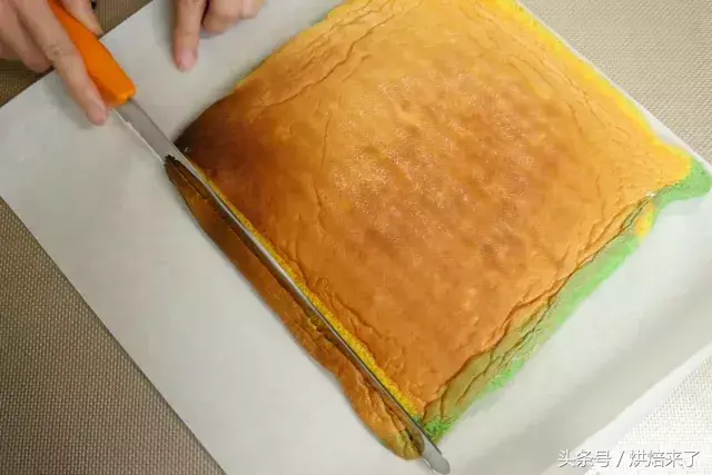 蛋糕彻底晾凉后,用锯齿刀斜切掉蛋糕胚的一端。