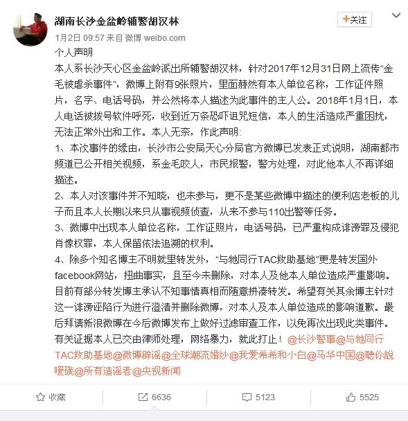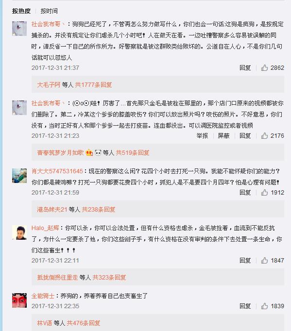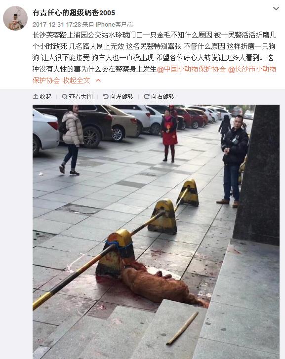 2017年12月31日下午,有网友发微博称“长沙芙蓉路一金毛狗被民警活活折磨几个小时致死”引起关注。