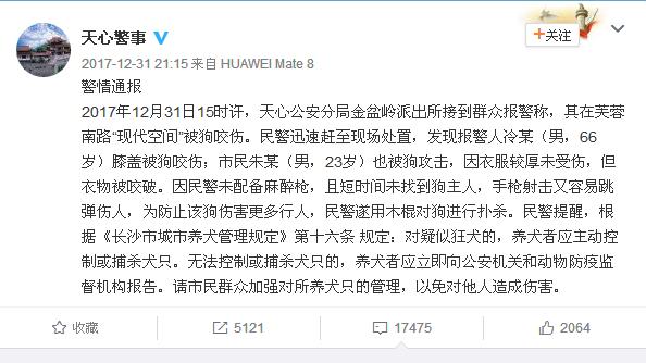 2017年12月31日晚间,长沙市公安局天心分局官方微博发布警情通报如下: