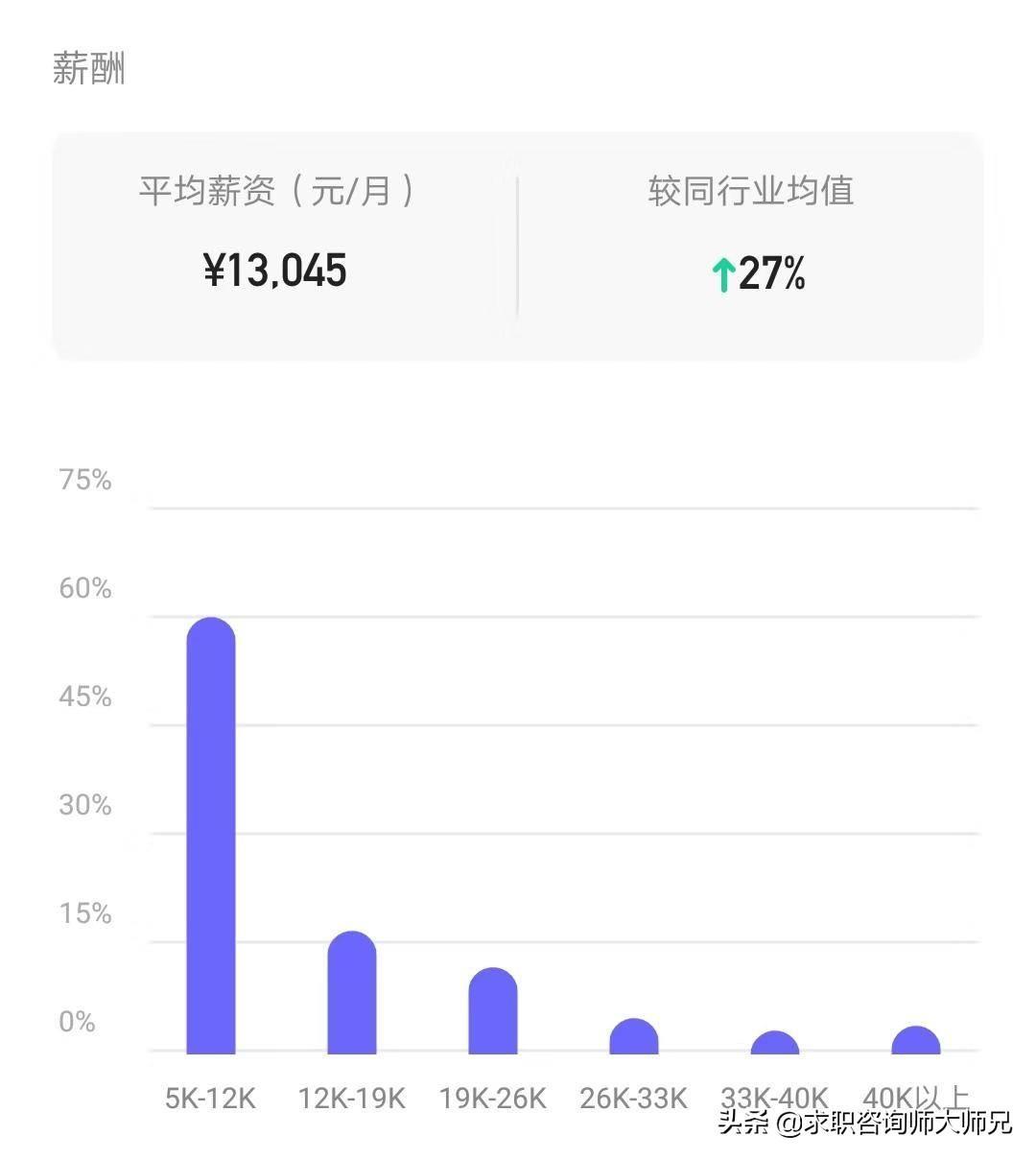 看完平均薪资,再来了解下不同薪资区间的分布情况。据大师兄APP数据显示,饿了么公司员工的薪资在5k-12k这个范围是最多的,达到60%。其次是在12k-19k这个范围,占比为17%。下图为具体情况: