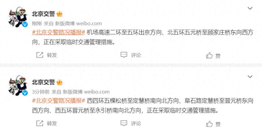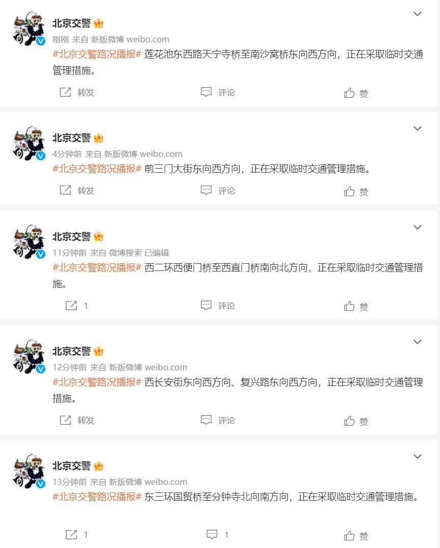 截至北京时间3月5日11时,据@北京交警 消息,当前北京多个路段正在采取临时交通管理措施,详情如下: