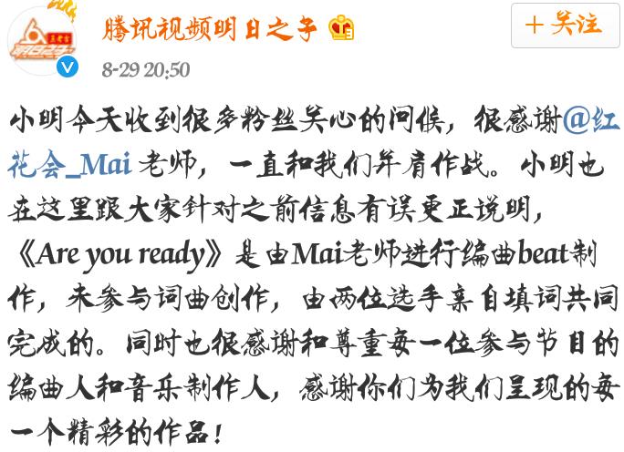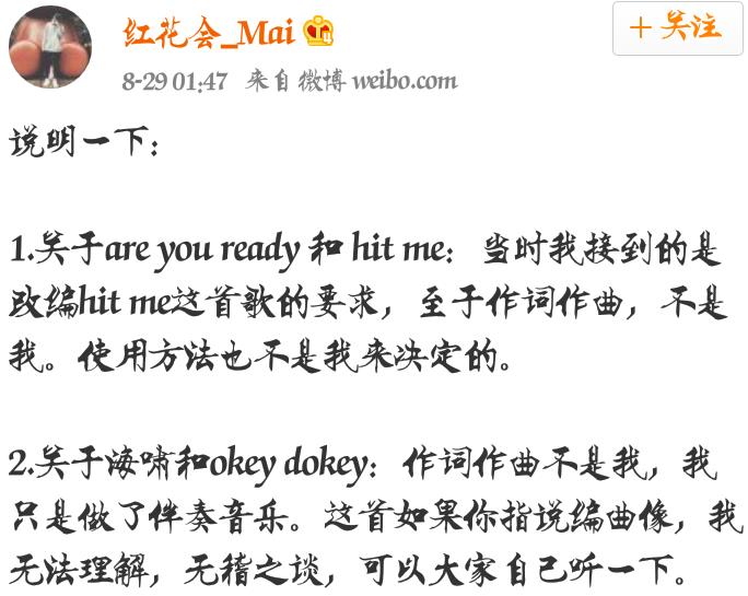 近日,红花会mai回应《Are You Ready》和《海啸》分别抄袭mobb《hit me》和mino&zico《okey dokey》事件,称作词和编曲并不是自己来决定的,编曲像其他的曲子是无稽之谈。