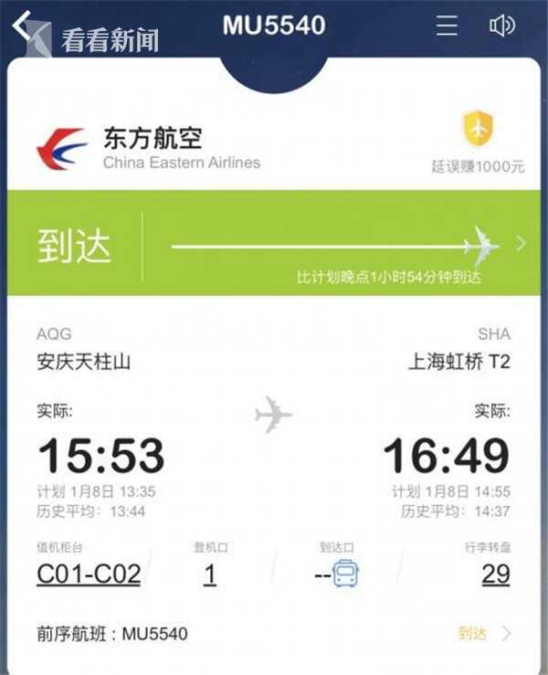飞常准的信息显示,由空客320执飞的MU5540最终晚点2小时18分钟从安庆起飞,于当天16:49抵达上海虹桥机场。