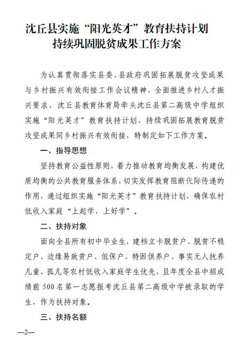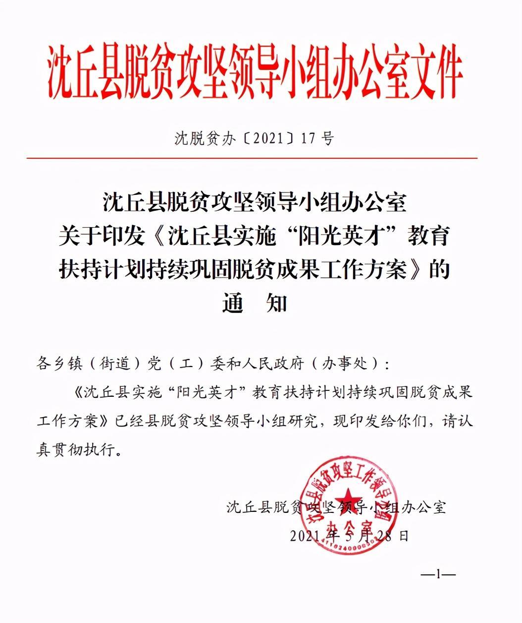 祝贺:《沈丘县实施“阳光英才”教育扶持计划持续巩固脱贫成果工作方案》