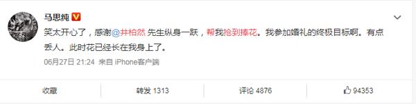 马思纯则是身穿黑色西装,作为中国传媒大学播音系毕业的她,现场担任司仪,还在井柏然的帮助下得到新娘捧花,随后非常喜悦的在微博发文,表达喜悦之情。