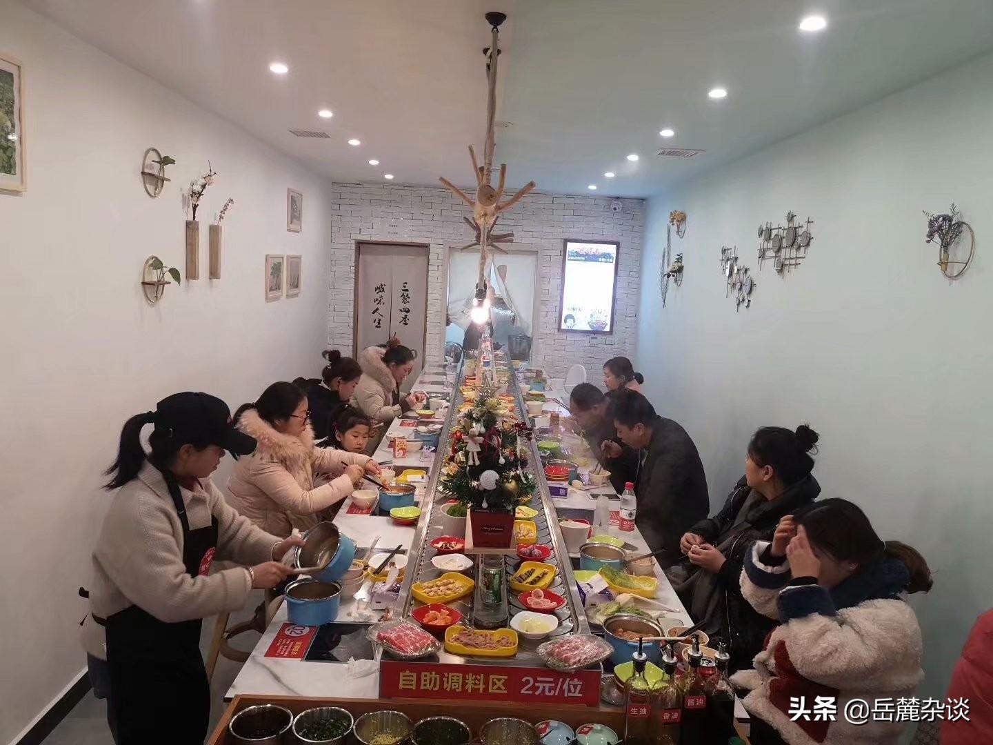 这种就餐模式借鉴日本回转寿司店的经营模式,又有重庆涮锅的底汤与调料特色,共有三四种不同的汤料,三十多种下锅食材,荤素搭配,便宜的盘点2元,贵的15元,随取随用随补,结算时按“红绿蓝黄白黑”的盘碟数来核计收费,十分惬意。难怪才开业,没有打广告就有如此之多的食客。
