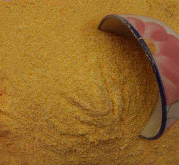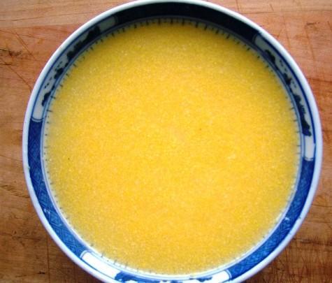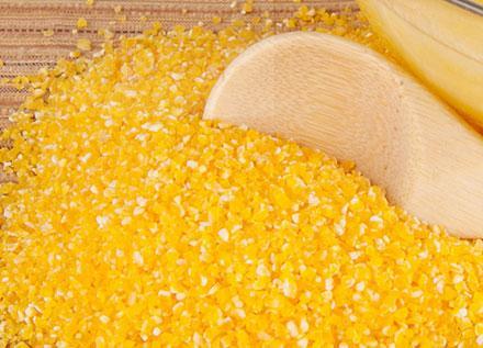 1、玉米成熟后晒干(最好用当年新收的玉米)去皮也可不去,上磨子粉碎成小颗粒,大约是放在手里有沙粒感的大小,也可磨成很细的面粉状。(亦可在超市购买现成磨好的)