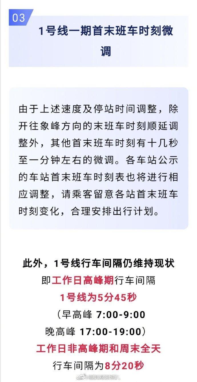 【今起,福州地铁1号线运营时间调整!】10月1日起,福州地铁乘车有变化,1号线一期列车运行时刻表调整,中秋国庆假期加开列车。简单可以概括为往象峰的末班车顺延8分钟,单向全程用时缩短1分钟,首末班车时刻微调。