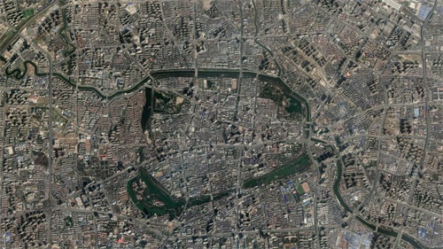 接下来我们将卫星地图视角下降至合肥市中心上空8公里处,此时看到的画面是合肥的老城区庐阳区。通过卫星图的画面我们可以看到,合肥老城区是有护城河的,虽然护城河边的城墙已经不见了踪影,但是取而代之的环城公园也在一定程度上弥补了这一缺憾。四季常绿的环城公园将整个老城区环绕其中,给喧嚣的城市增添了一份宁静。