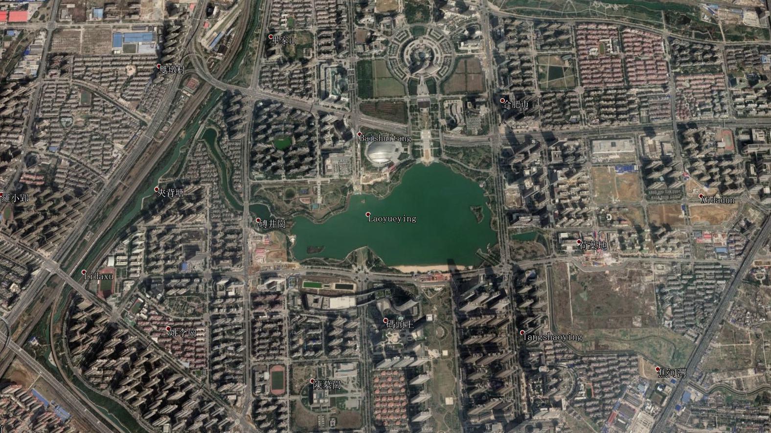 好了我们将卫星地图视角转向合肥市区的西南部,此时看到的画面是合肥的政务区。这里是合肥市政府所在地,是目前合肥最繁华,房价最高的区域。画面中心的人工湖因为形似一只天鹅,由此得名——天鹅湖。