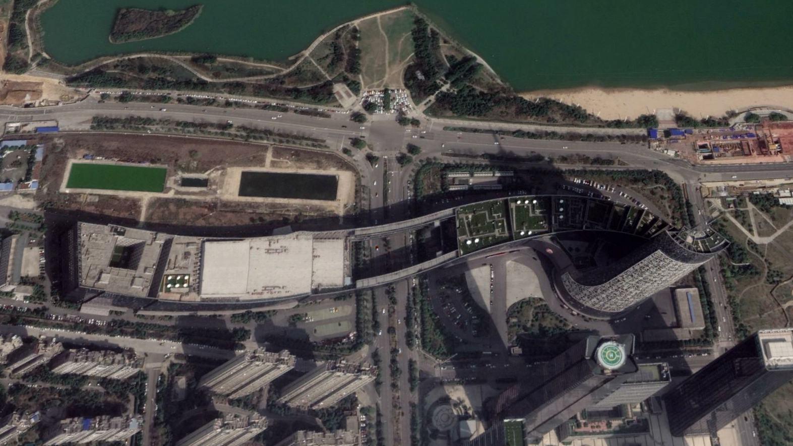 最后我们继续将视角下降,通过卫星图我们可以看到天鹅湖南岸有一座造型非常别致的大楼。这就是目前的安徽第一高楼——安徽广电中心。高度301米,地下二层,地上46层。