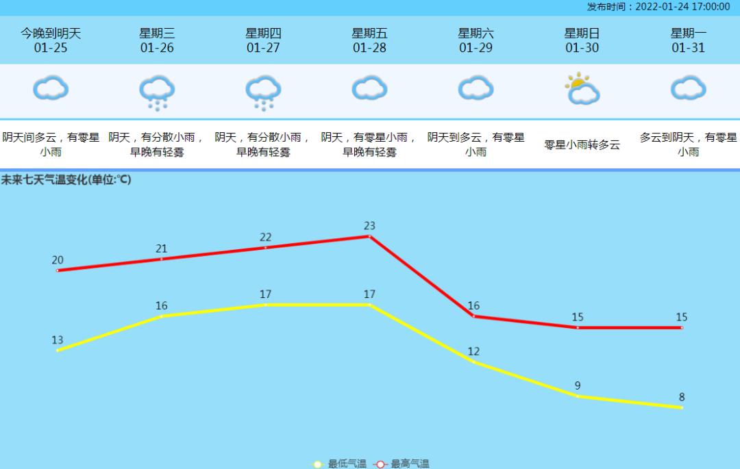 26日至28日暖湿气流活跃,雨雾天气趋明显,早晚能见度低;29日白天起受中等偏强冷空气影响,日平均气温下降5~7℃;2月1日起又有弱冷空气补充,气温小幅下降并伴有小雨,体感湿冷。