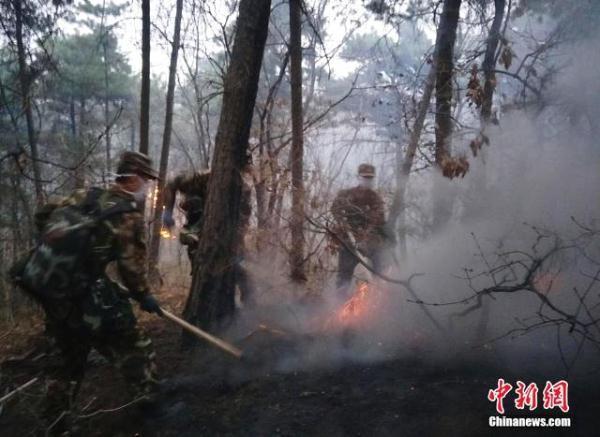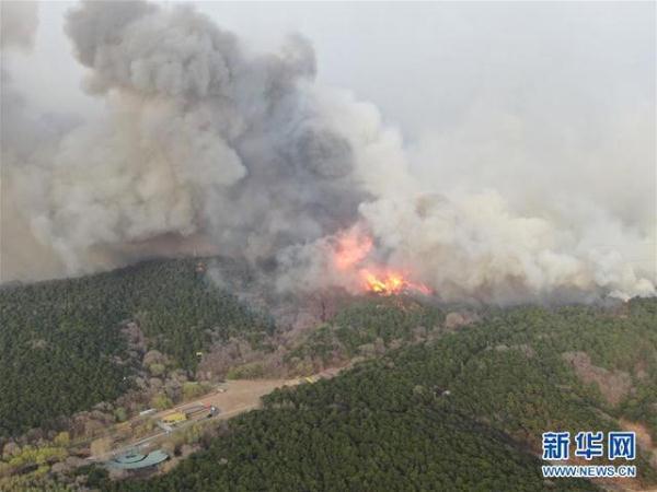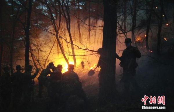 根据多名网友发布的视频,棋盘山的山头上冒起二三十米高的火苗,并且浓烟滚滚。当天沈阳为大风天气,风力助长了火势,火势蔓延很快,火苗从山头不断向下扩展。火灾发生后,森林消防率先投入救援,随后陆续得到增援。截至当晚8时,大火仍未被扑灭,虽有多个起火点得到控制,但仍有复燃情况发生。图为沈阳棋盘山大火扑救现场。