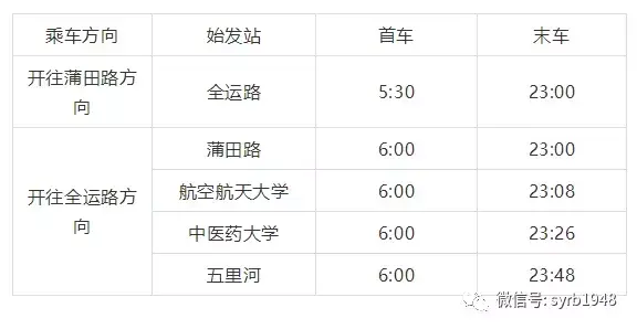 沈阳地铁的首末车发车时间如下表