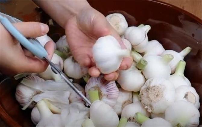 1.做糖蒜最好买这种新鲜的大蒜,最好是刚出土的,不要买那种干皮的大蒜和陈蒜,把大蒜的外皮剥掉,留里面的1到2层就可以,再用剪刀把根部剪掉,尾巴也剪掉,留1厘米长就行了,像这个样子。