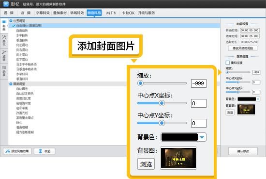 除了通过“加贴图”功能,添加封面图片,我们还可以通过“背景图”功能,给视频添加封面图片。我们给刚才添加的黑幕视频,应用“自由缩放(画面裁剪)”功能,将“缩放”滑块拉到最左边,点击“背景图”处的“浏览”按钮,导入封面图片即可。