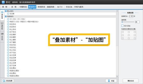 快速添加封面图片:将进度条的滑块,向左拉到0秒的位置,点击“叠加素材”-“加贴图”,点击“添加贴图至列表”,导入事先准备好的封面图片。时长设成0.4秒(也就是一帧)。