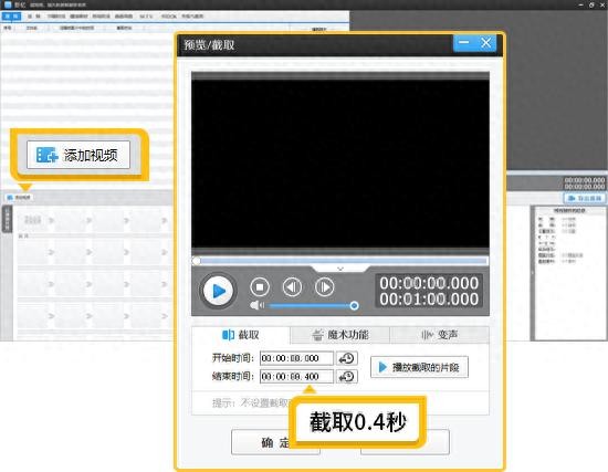 导入黑幕视频:首先,打开影忆软件,在主界面点击“视频”选项卡,点击“添加视频”按钮,导入一个黑幕视频,截取0.4秒。