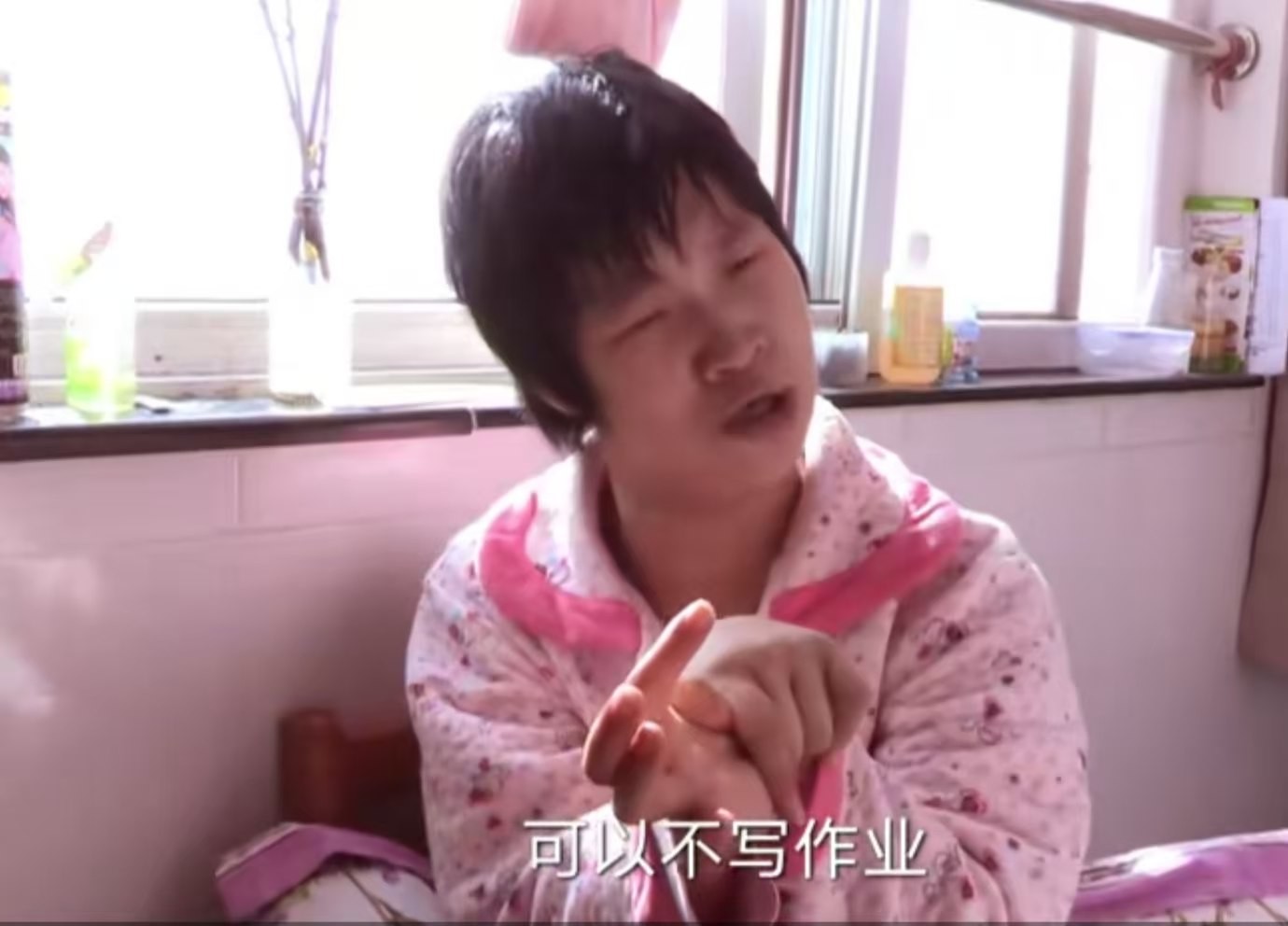 因为她患有脑瘫,先天四肢不协调,生活没有办法自理。