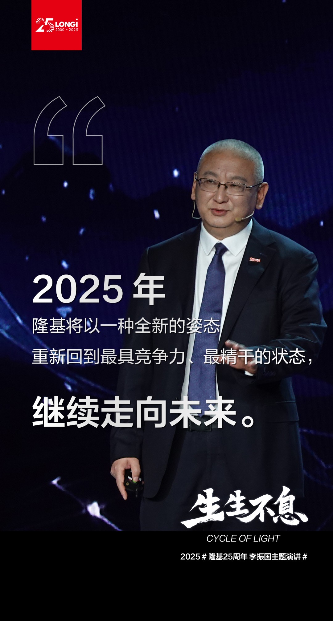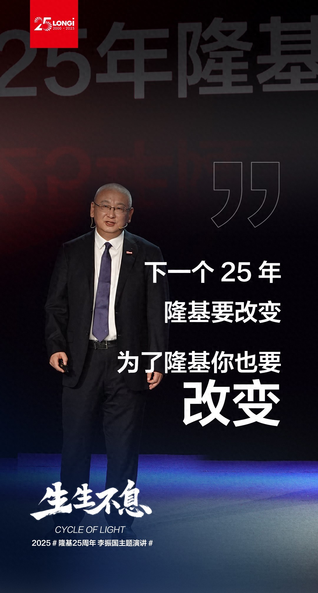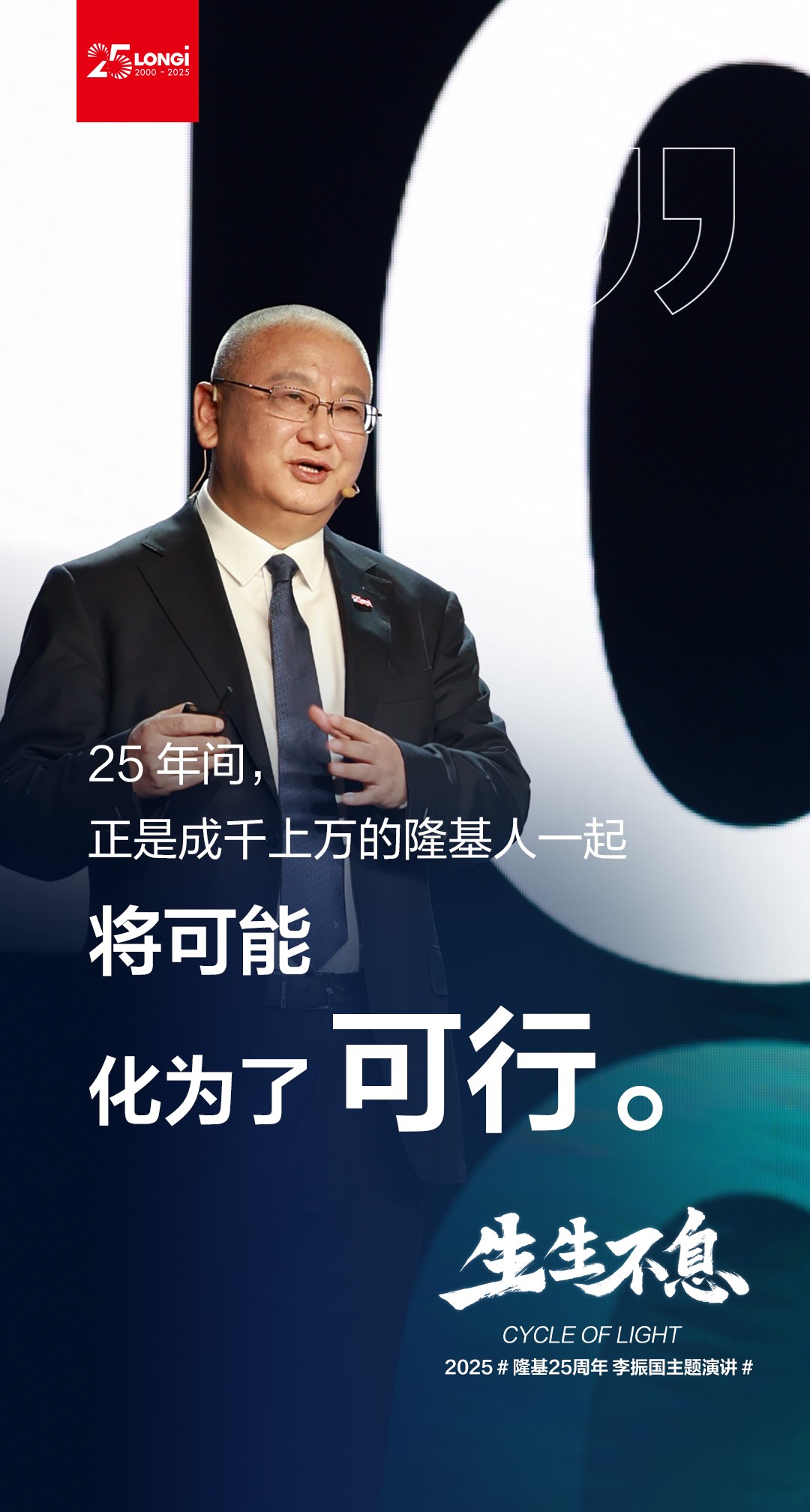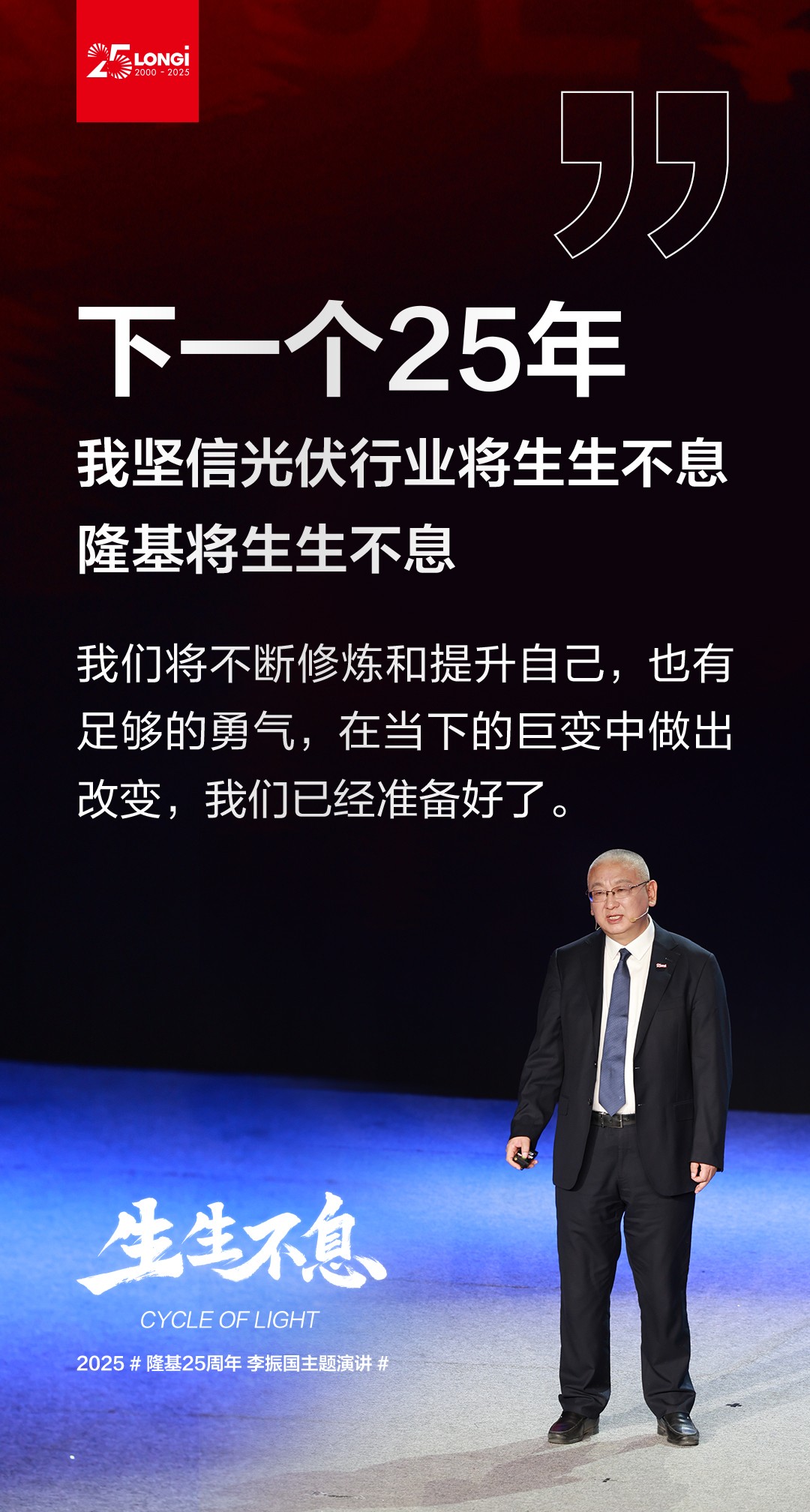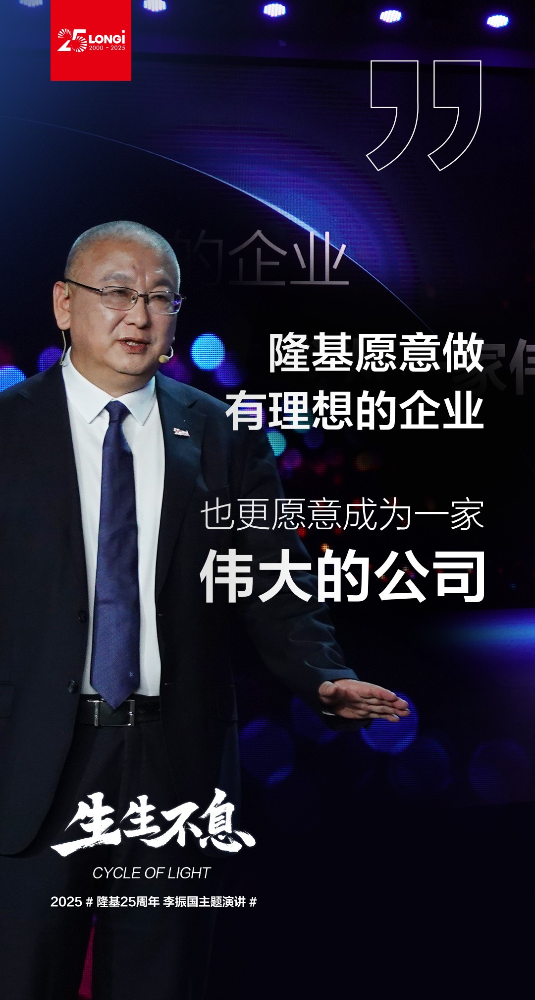 他不仅回顾隆基过去25年的发展历程,也直面目前行业和公司面临的境况,展望隆基的下一个25年,并向所有关心、支持隆基成长的人们表达了最诚挚的感谢。