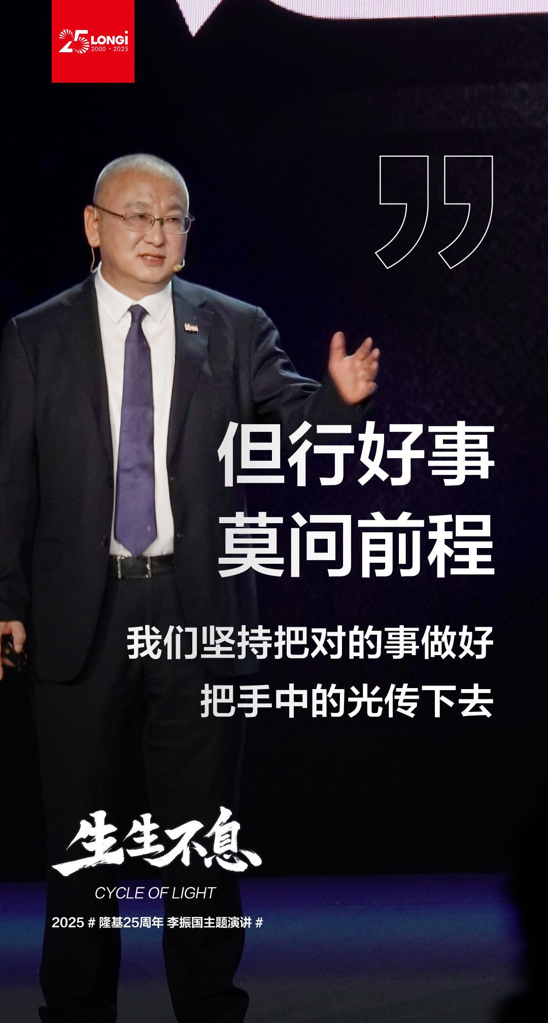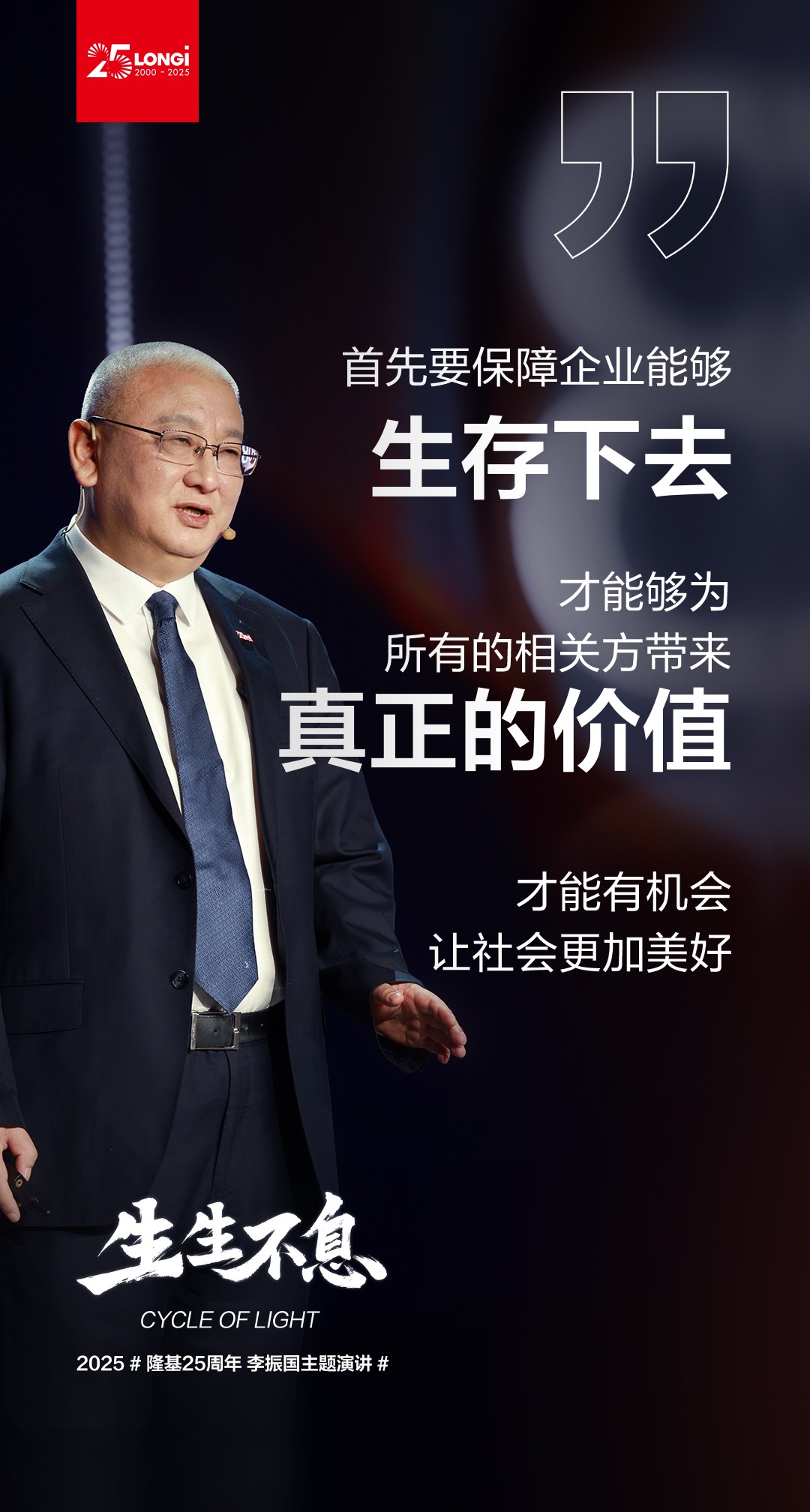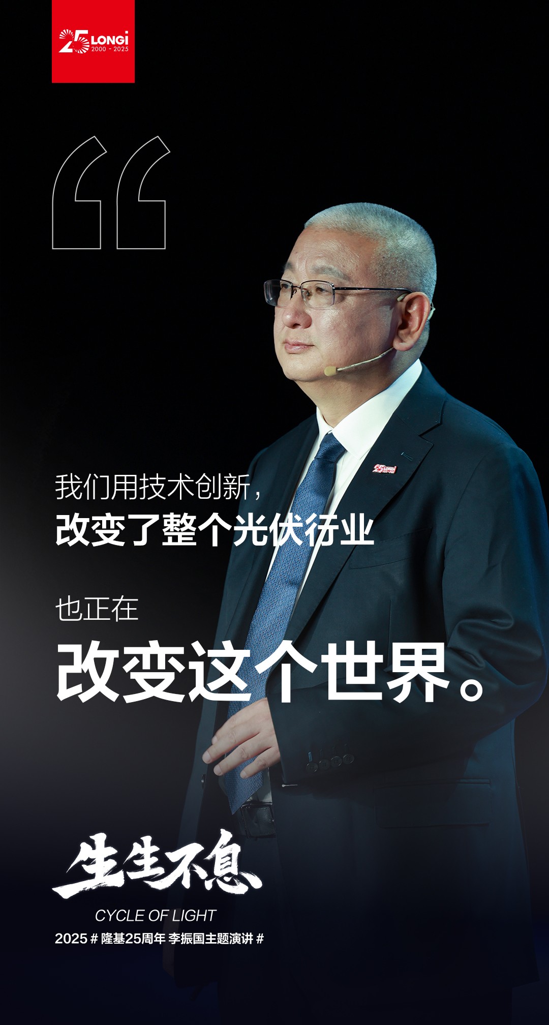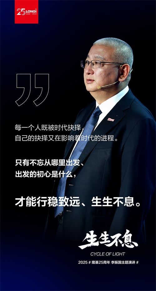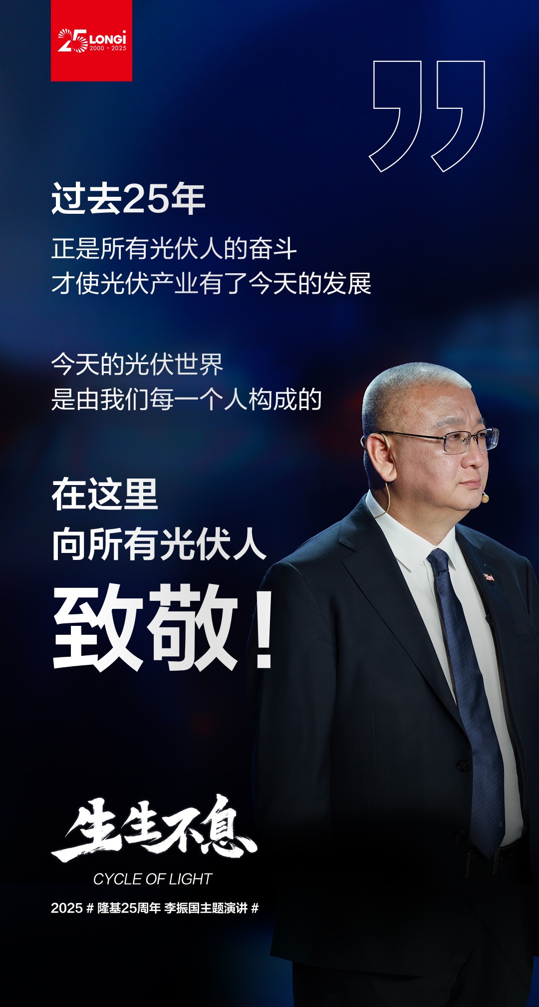 他不仅回顾隆基过去25年的发展历程,也直面目前行业和公司面临的境况,展望隆基的下一个25年,并向所有关心、支持隆基成长的人们表达了最诚挚的感谢。