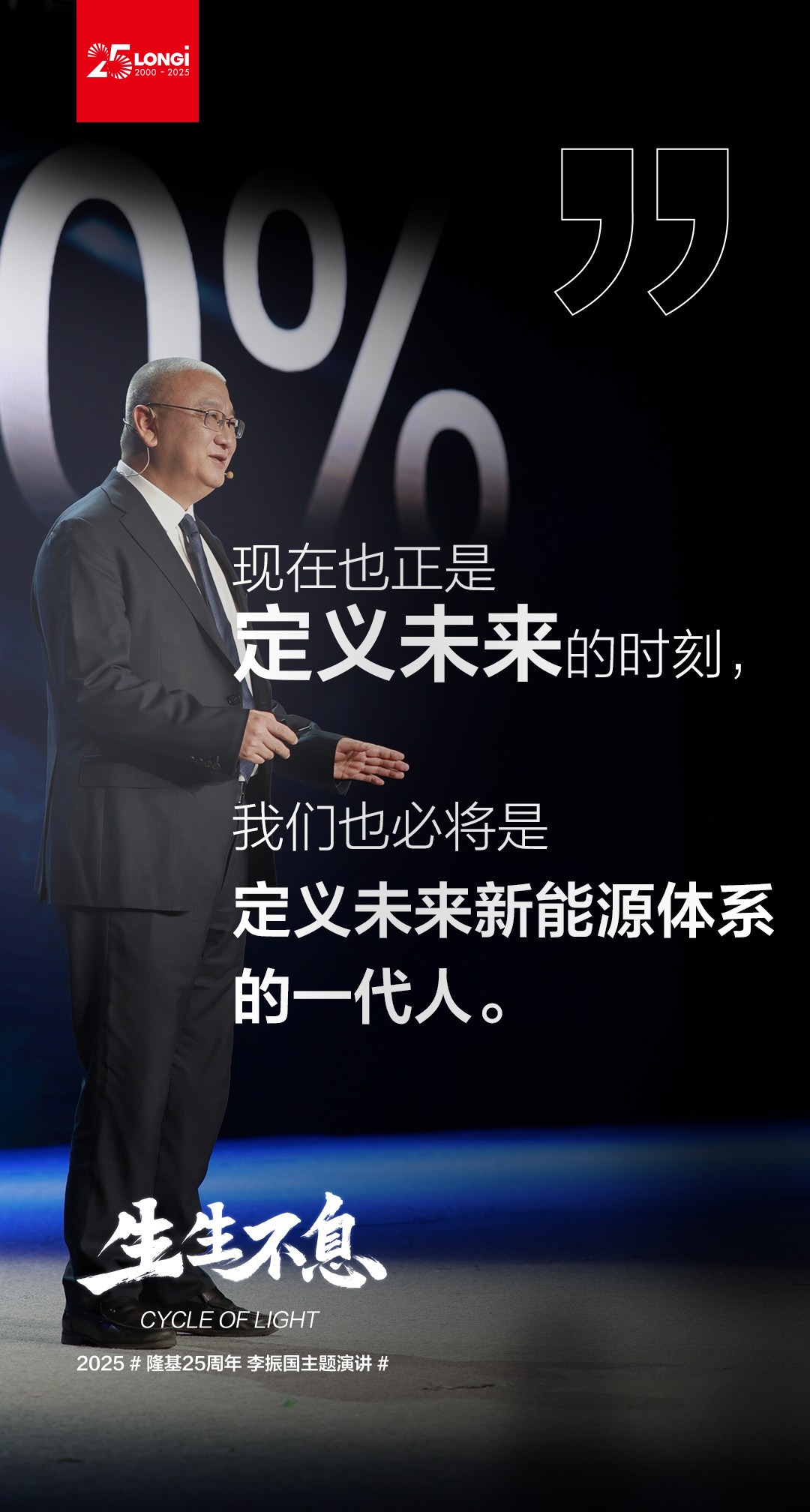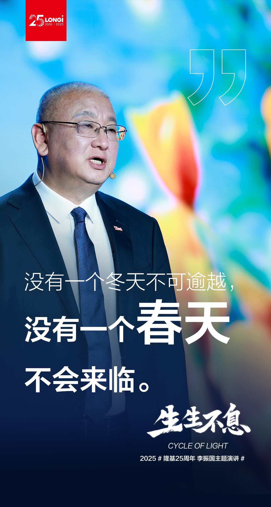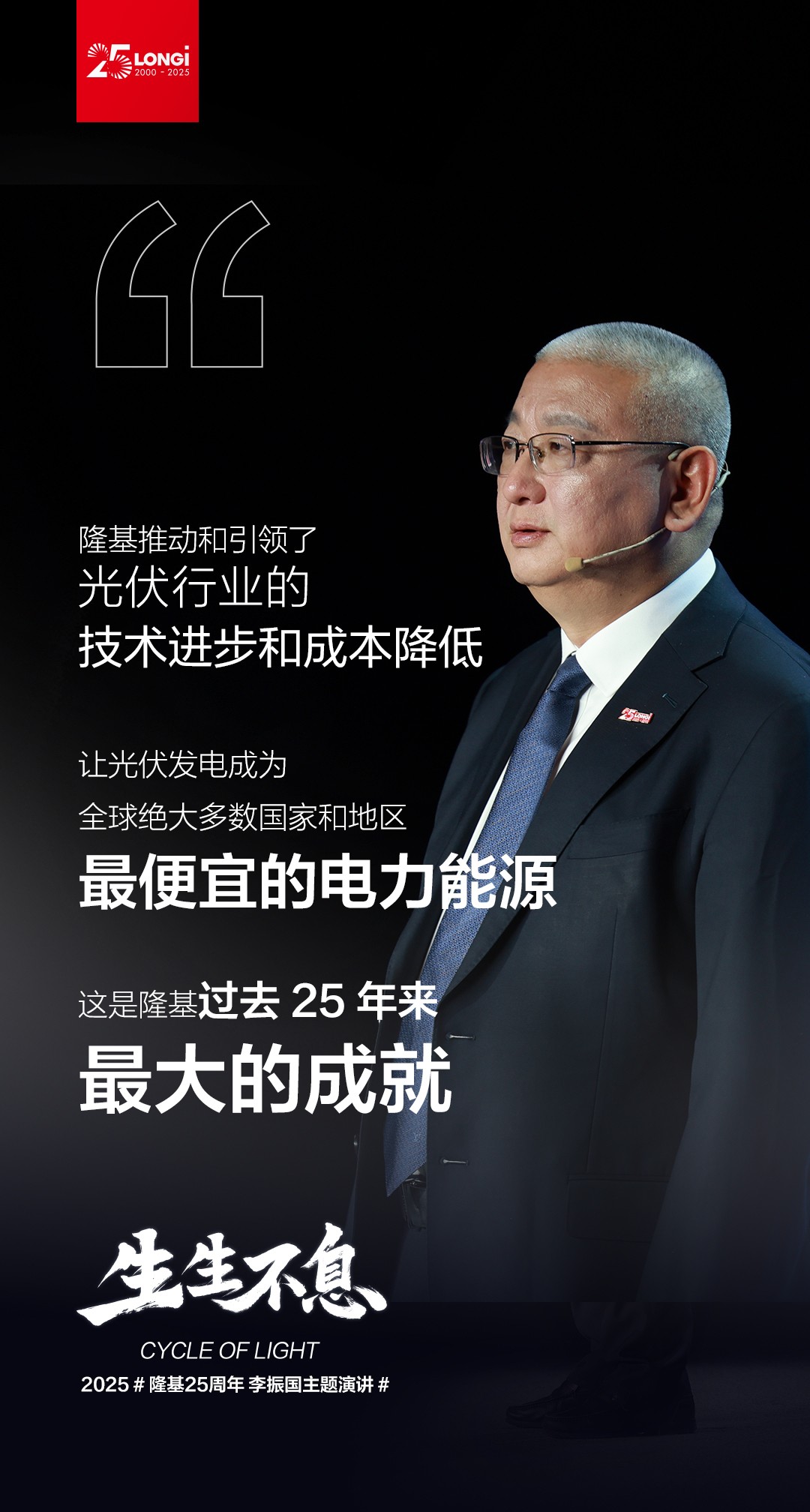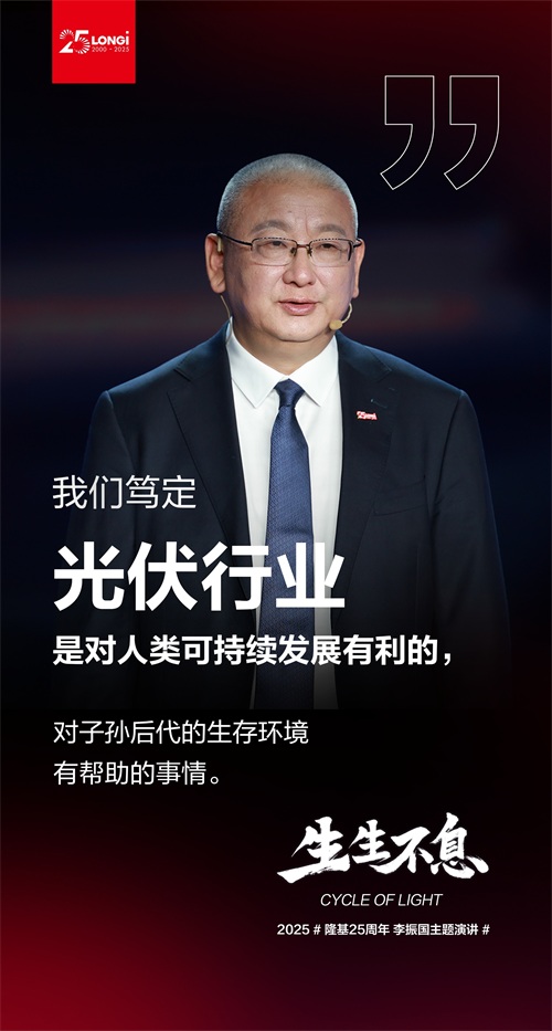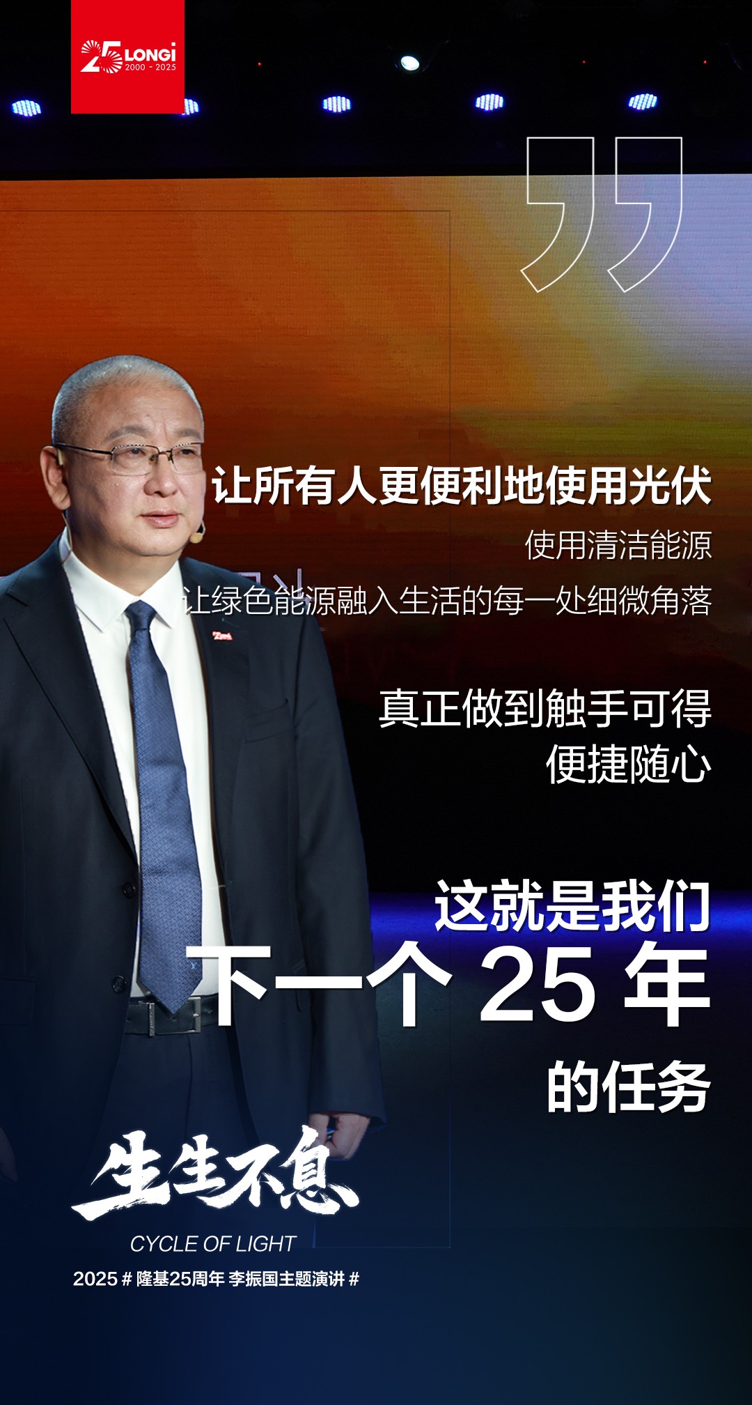 他不仅回顾隆基过去25年的发展历程,也直面目前行业和公司面临的境况,展望隆基的下一个25年,并向所有关心、支持隆基成长的人们表达了最诚挚的感谢。