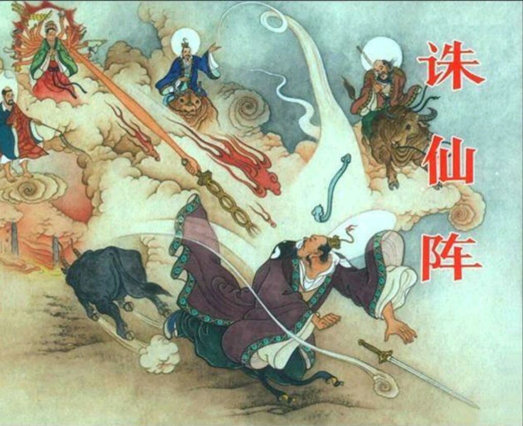 三教会盟诛仙阵。诛仙阵内有四口宝剑,分别是正东诛仙剑、正南戮仙剑、正西陷仙剑、正北绝仙剑。元始天尊和老子欲破诛仙阵,却人手不够,因为此阵须四位道法高深者方能破得,#昆仑山#门下弟子没有这个能力。准提道人约请接引道人一同前来助阵。