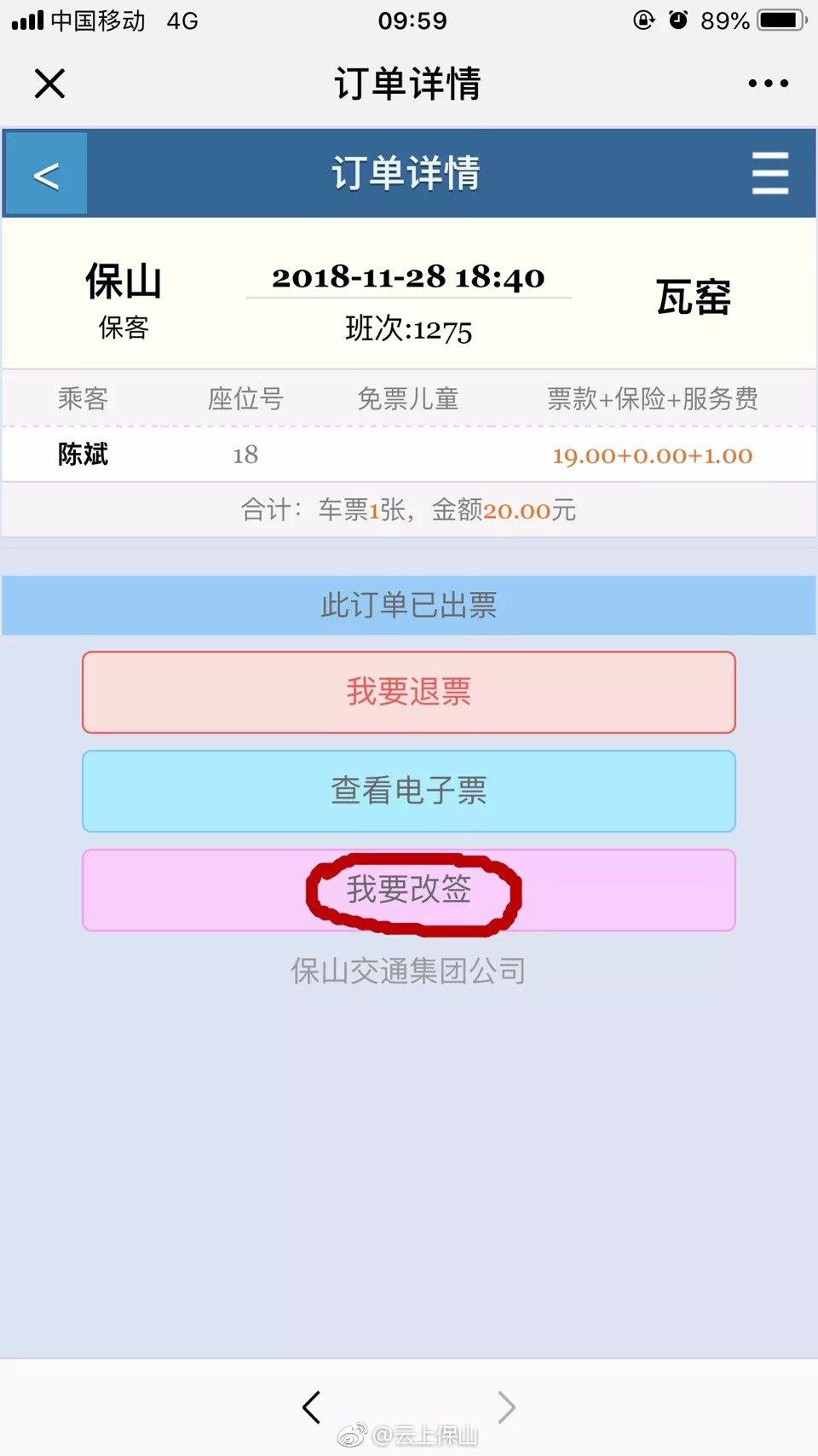 曾经,我们在网上买一张汽车票;拿起手机从下单到出票分分钟搞定。但改签的过程却很艰难;Step1:去汽车站;Step2:找到对应的改签窗口;Step3:排队等候完成车票改签。即使用户去车站窗口改签了,往往需要花费大量的时间奔波在路上,一个人跑到车站手足无措的找退改窗口?终于轮到你改签了却没有合适出行班次?心力交瘁......但是,保交微信购票是美貌与智慧并存,英雄与侠义的化身我们让你从此退票改签再也不用去窗口排队了!!可直接进行微信改签。没错,就是这么简单!1、票务服务—— 》2、我的订单—— 》3、我的订单➜查看订单详情—— 》4、选择改签日期及班次—— 》5、改签完成。