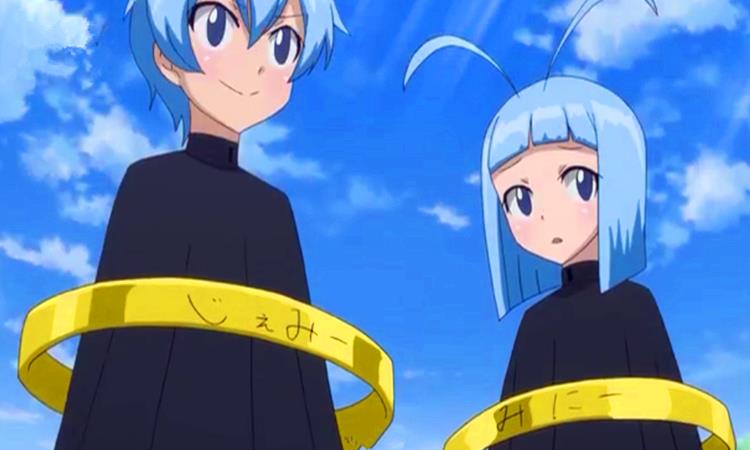 黄道十二宫的双子座星灵,为稀有的金钥匙所召唤。外表分别是带着笑脸和哭脸的蓝色人偶,一个叫杰米,一个叫米尼,统称杰米尼,可以复制与自己魔力相近的人的样貌,能力,思想,可以存续2个人,口头禅“霹雳霹雳”。在7年之后能够以变成露西的样子帮助露西施展星灵的超魔法“星图史话”。