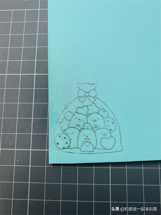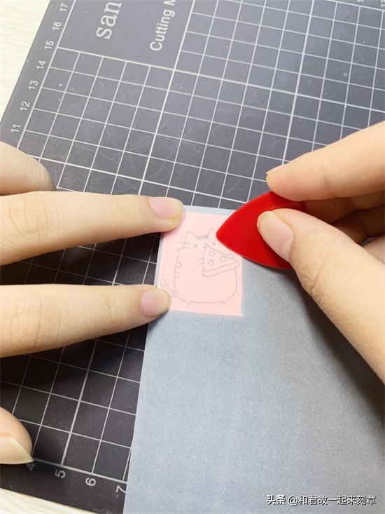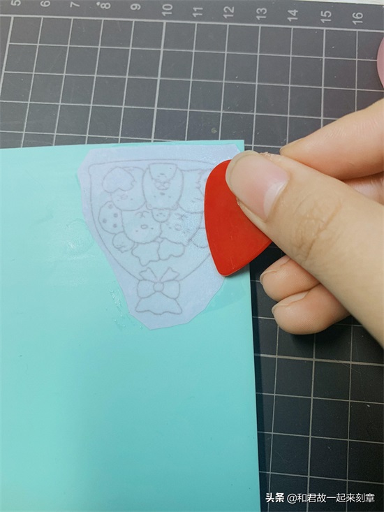 4.把描好图的硫酸纸反铺(就是描了图的那一面直接接触橡皮)在橡皮砖上,用透明胶带固定住,拿拨片(或者是其他边缘平滑的小物品 )轻轻的刮,每一处都要刮到。