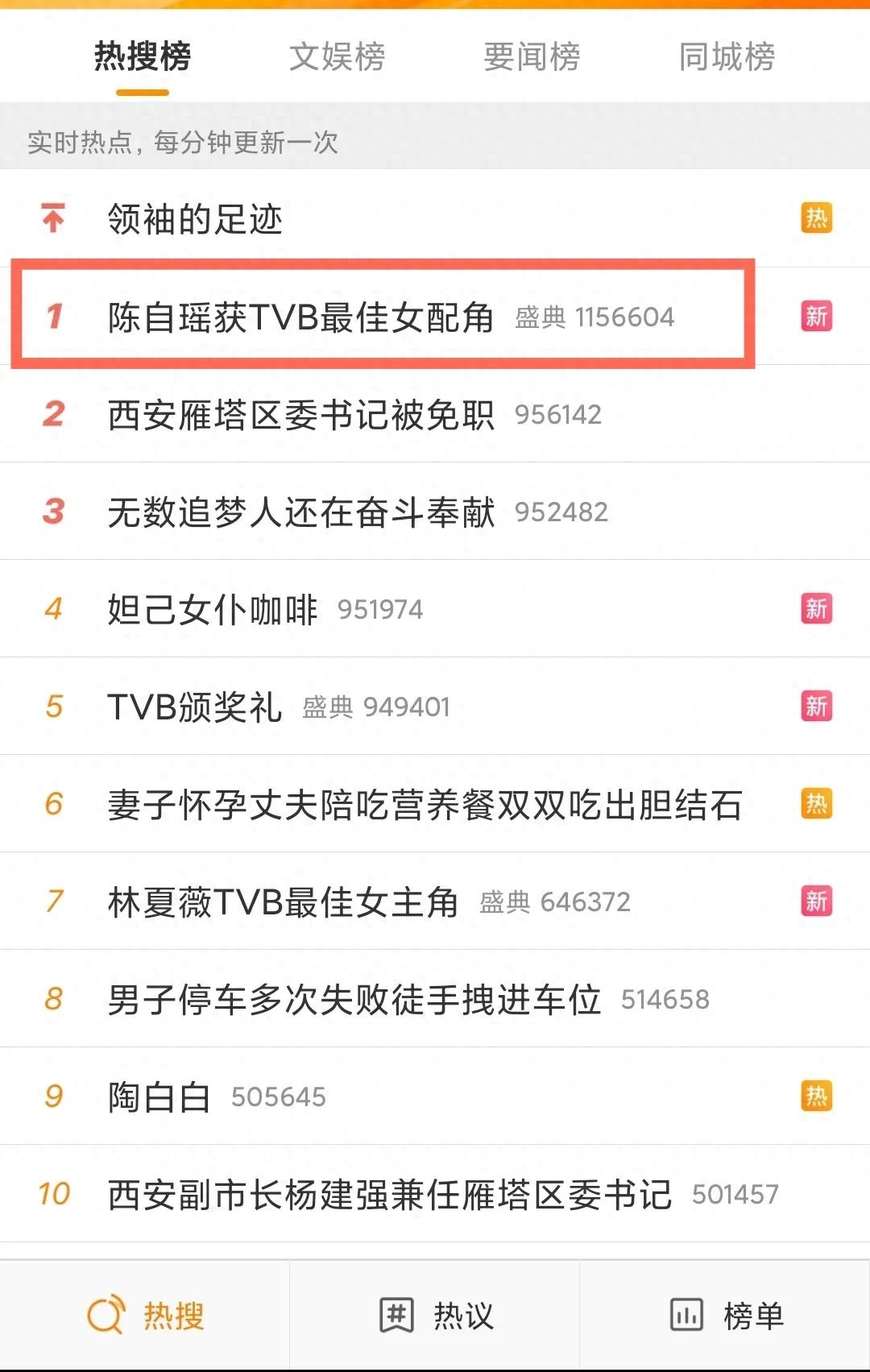 最新的全国热搜第一名“陈自瑶获TVB最佳女配角”。
