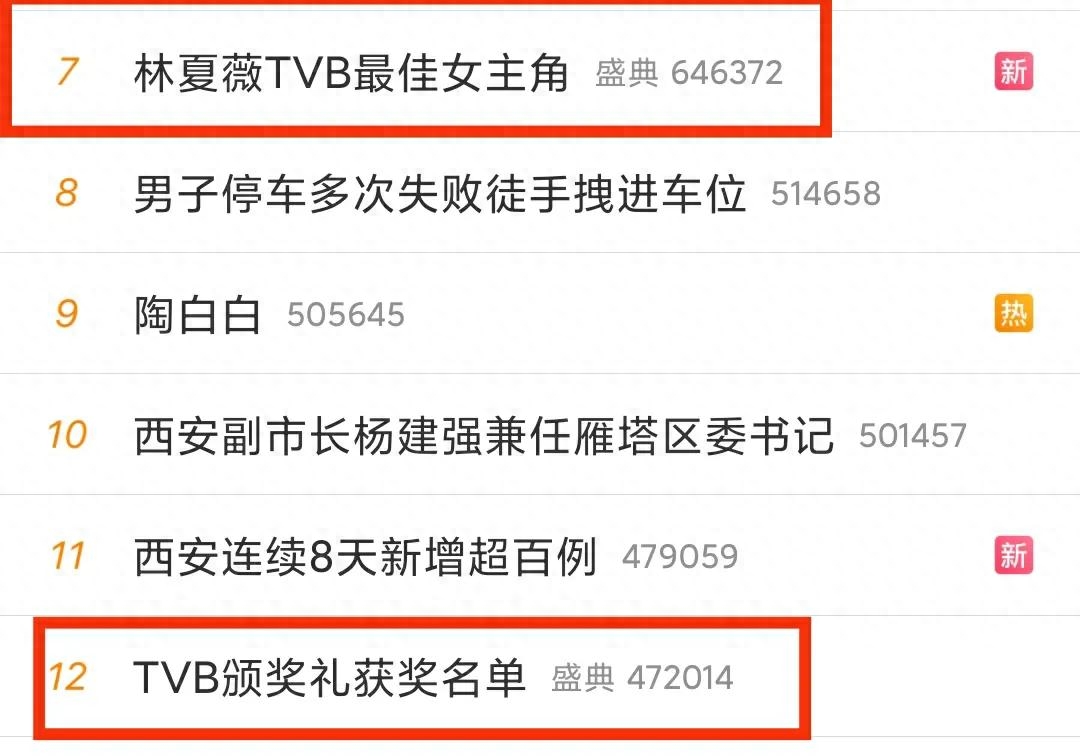 风头居然压过了热搜第7条的“林夏薇荣获TVB最佳女主角”和第12条“TVB颁奖礼获奖名单”两条消息。