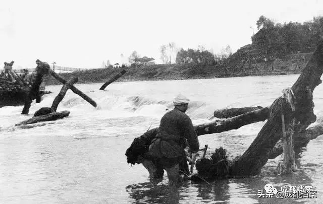江面上矗立着一长排三角形的木头桩子,下面是一道堤坝。一群汉子正拽着一根粗大的绳子,只等三声炮响,大伙儿使劲一拉,河坝决堤,岷江水就将奔泻而出。美丽的天府之国新一年春耕夏种,秋收冬藏的画卷,由此展开,一年一度的放水节,也传承至今。