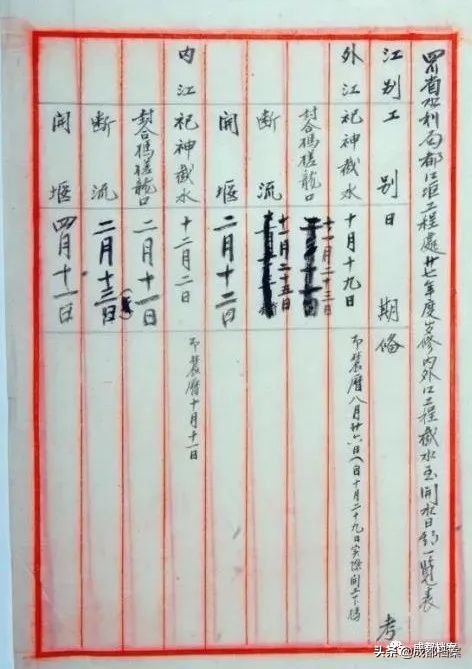 下面这份档案来自都江堰市档案馆,形成于1938年,标题为“四川省水利局都江堰工程处廿七年度岁修内外江截水至开水日期一览表”。