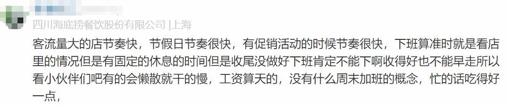 海底捞员工原话:客流量大的店节奏快,节假日节奏很快,有促销活动的时候节奏很快,下班算准时就是看店里的情况