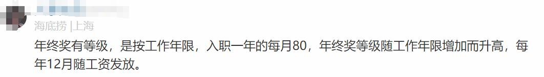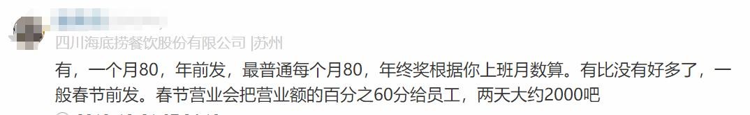 海底捞员工原话:有,一个月80,年前发,最普通每个月80,年终奖根据你上班月数算。有比没有好多了,一般春节前发。春节营业会把营业额的百分之60分给员工,两天大约2000吧