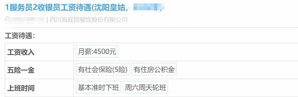 第三位自曝薪酬的,是海底捞的服务员+收银员,他的月薪是4.5K,有五险一金,工作日准时下班,周末要轮班
