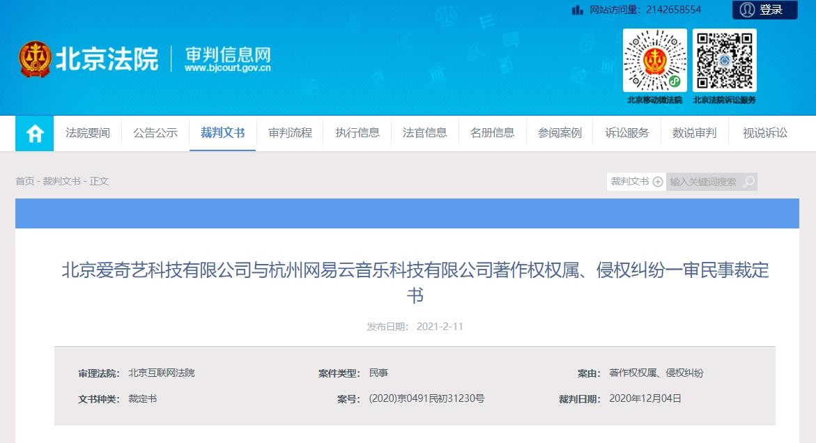 2月18日,南都记者从北京法院审判信息网获悉,近日,北京互联网法院公布爱奇艺关联公司北京爱奇艺科技有限公司与网易云关联公司杭州网易云音乐科技有限公司著作权权属、侵权纠纷一审民事裁定书,爱奇艺要求网易云音乐赔偿30万元,网易云音乐提出管辖权异议,最终被法院驳回。