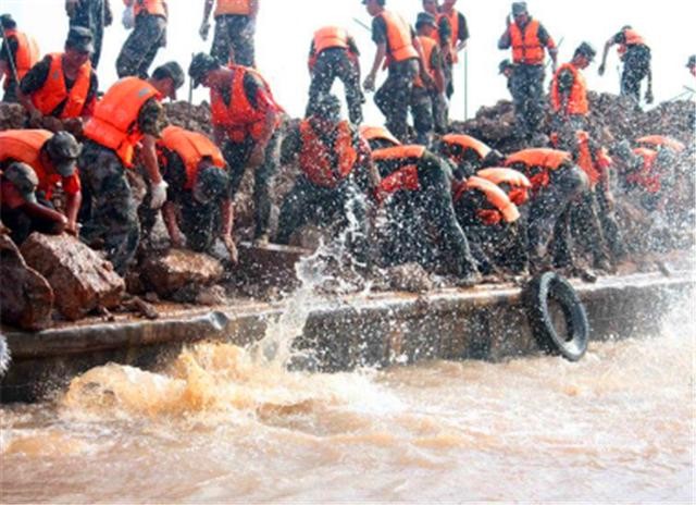 而在群众转移的时候,身穿橄榄绿的勇士们却迎着洪水而上,要拼死将洪水推回。
