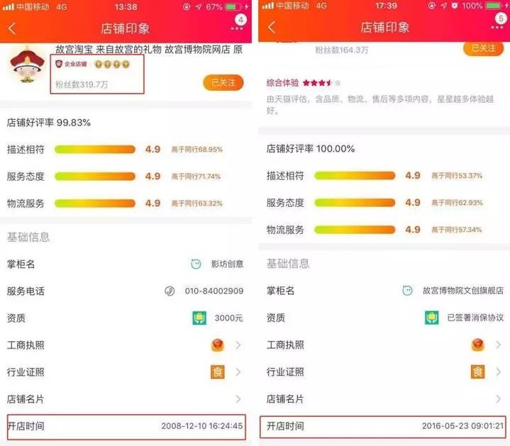 开店时间也不一样,“故宫淘宝”要早得多,2008年就进驻了,而“故宫文创”则要到2016年。