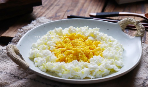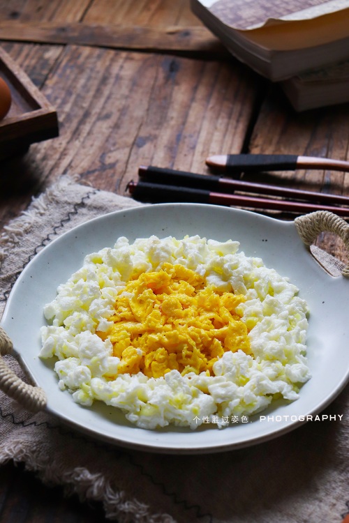 5.紧接着往锅中加1勺油,放入蛋黄,同样开小火,用筷子来回滑动将蛋黄铲出碎块状,倒入剩下的姜醋汁混合均匀,把炒好的蛋黄盖在蛋白上就做好啦
