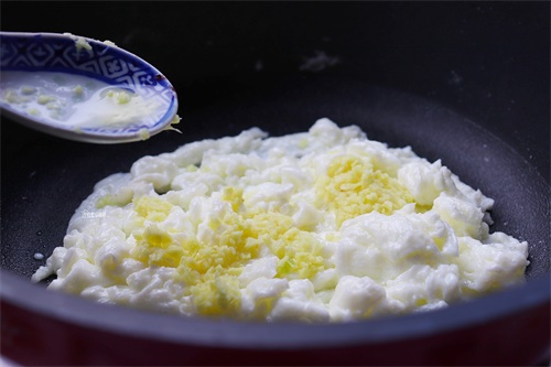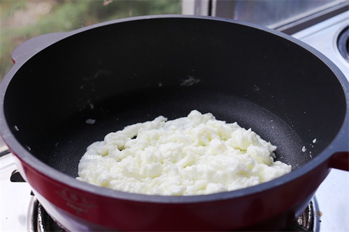 3.滑蛋时火力不宜过猛,否则底部会变成焦脆,待蛋液还未完全凝固时