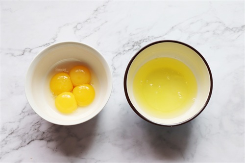 1.首先,准备两个小碗,把鸡蛋磕开,将蛋清和蛋黄分离,分别装在两个碗中备用。磕的时候要小心些,尽量不要弄破蛋黄,以免混入蛋清中。