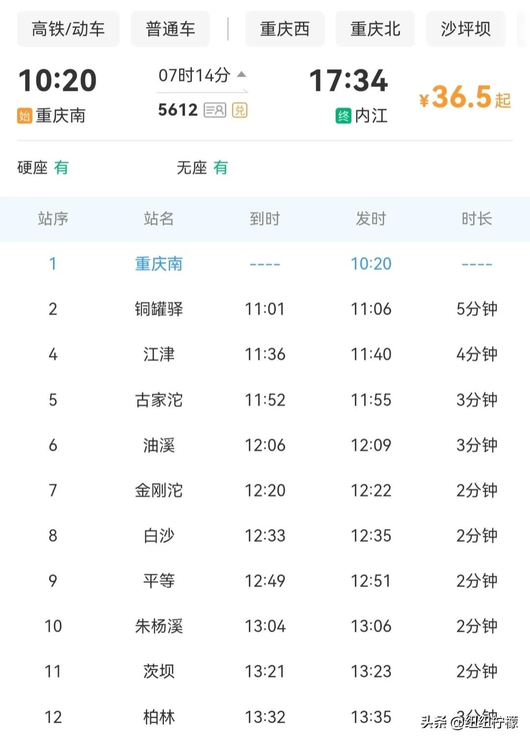时间的流逝总是那么不经意,历史的车轮滚滚向前不断推动着时代的变迁,时代在变,我们的步伐也在不断前进。重庆南站曾经是辉煌灿烂的,如今却变得没落起来。动车、高铁的出现,让绿皮火车的短板越发明显,如今的绿皮火车已然越来越少。从重庆西至内江北,高铁最快只需37分钟便可到达,而乘坐5612次列车,从重庆南站到内江站,需要7小时14分。如果你赶时间,你必然不会选择这趟绿皮火车。