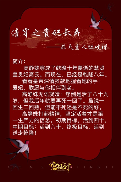文笔幽默,剧情不狗血,和乾隆没有感情线,只是为了生存而已。对其它后妃们的人物塑造也非常出色,不只是工具配角。