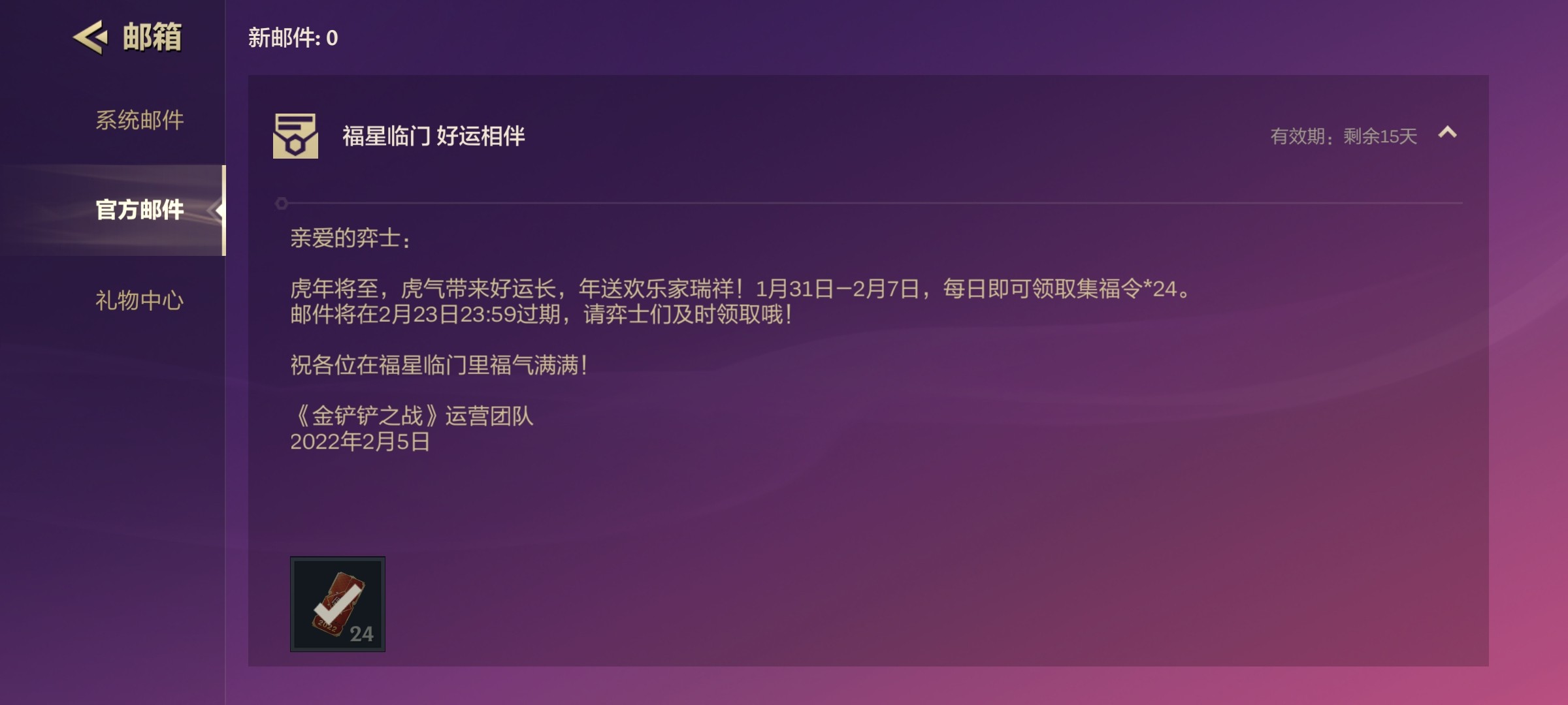 首先,福星临门版本开启后,每位玩家都获得了36张集福令。其次,在1月31日~2月7日之间,官方每天赠送24张集福令,八天共计192张。