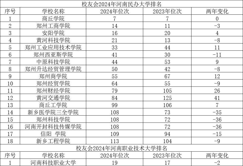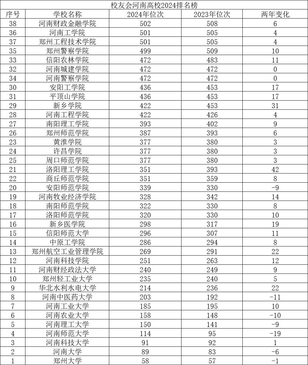 同上年度相比,2024年排名上升最高的是洛阳理工学院,从去年的第393位升至第351位,上升了42位,新乡学院从去年的第453位上升至第422位,上升了31位,华北水利水电大学从第236位升至第214位,上升了22位,郑州航空工业管理学院从第291位升至第269位, 上升了22位,新乡医学院上升了19位,安阳 工学院和平顶山学院上升了14位,河南科技学院上升了12位,信阳师范大学和信阳农林学院上升了11位,河南工业大学、洛阳师范学院和郑州警察学院上升了10位。