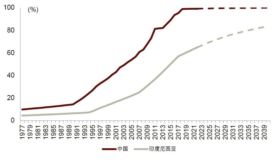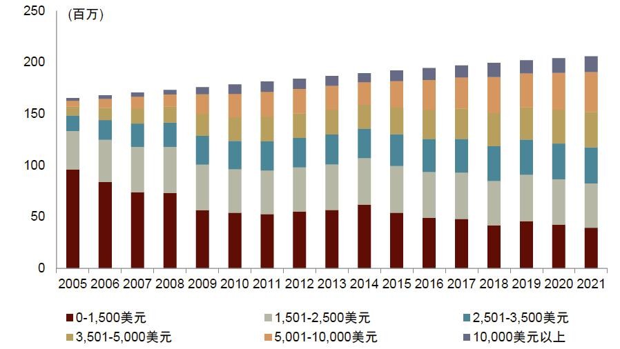 人均收入方面,印尼收入低于1,500美元的人群(可能是收入足够支撑基本生活支出的群体)占比从2005年的68%降至2020年的19%,而收入位于2,501-10,000美元区间的人群占比则从2005年的12%上升至2022年的52%。我们认为这一收入增长趋势具有可持续性,中产阶层[3]和中产家庭有望不断壮大。