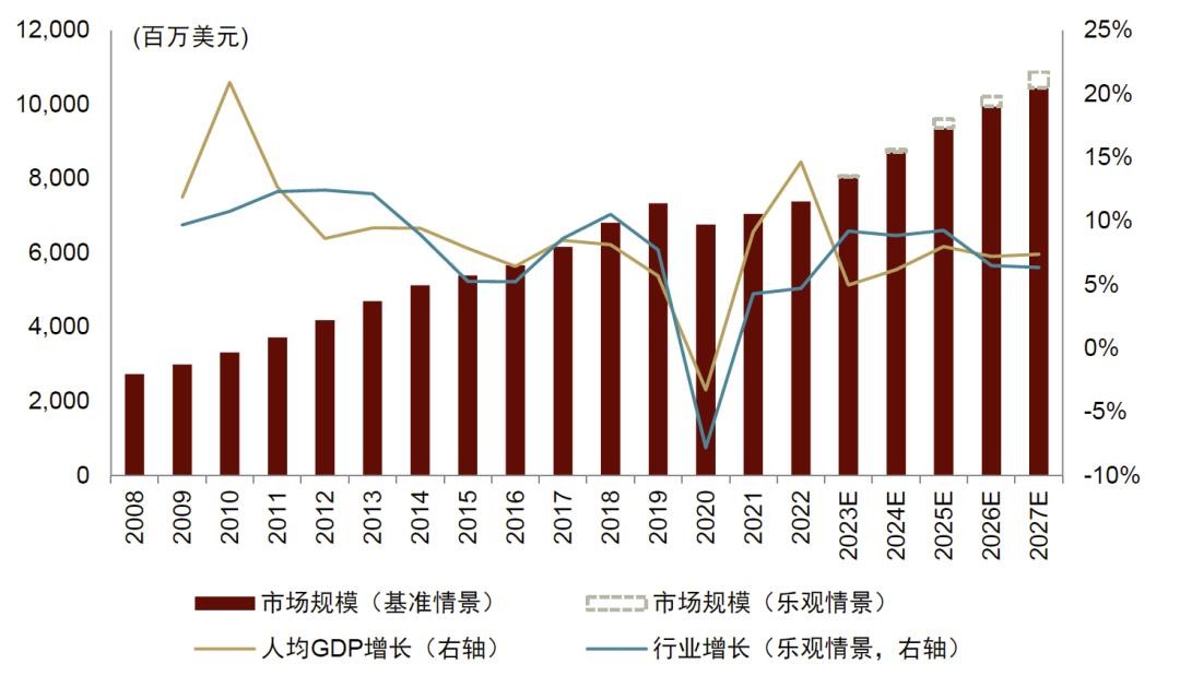 展望未来,我们看好行业前景,预计2027年行业规模扩大至109亿美元(乐观情形),对应2022-2027年均复合增速8.04%。主要驱动力包括:(1)财富不断积累推动可选消费支出增加;(2)城镇化和现代住房需求上升;(3)新兴城市的形成(非一线城市)。家居用品门店、尤其是现代连锁店渗透率上升以及购买力改善有望带来更多新开门店和单店收入增长,而新开门店数量与单店收入是推动行业增长的两个关键指标。